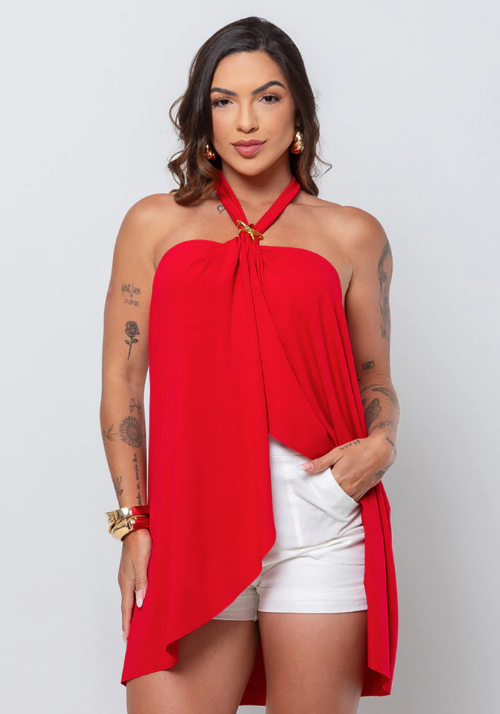 A Blusa Lorrene tem caimento leve e modelagem soltinha, com amarração no pescoço e um entrelaçado central que traz como detalhe uma charmosa estrela. A frente levemente alongada adiciona movimento e modernidade ao visual. Uma peça fresca, confortável e perfeita para compor looks estilosos.Tamanho: unico (36 ao 46)Tecido:ViscolycraComposição:95 % vicose 5%elastano