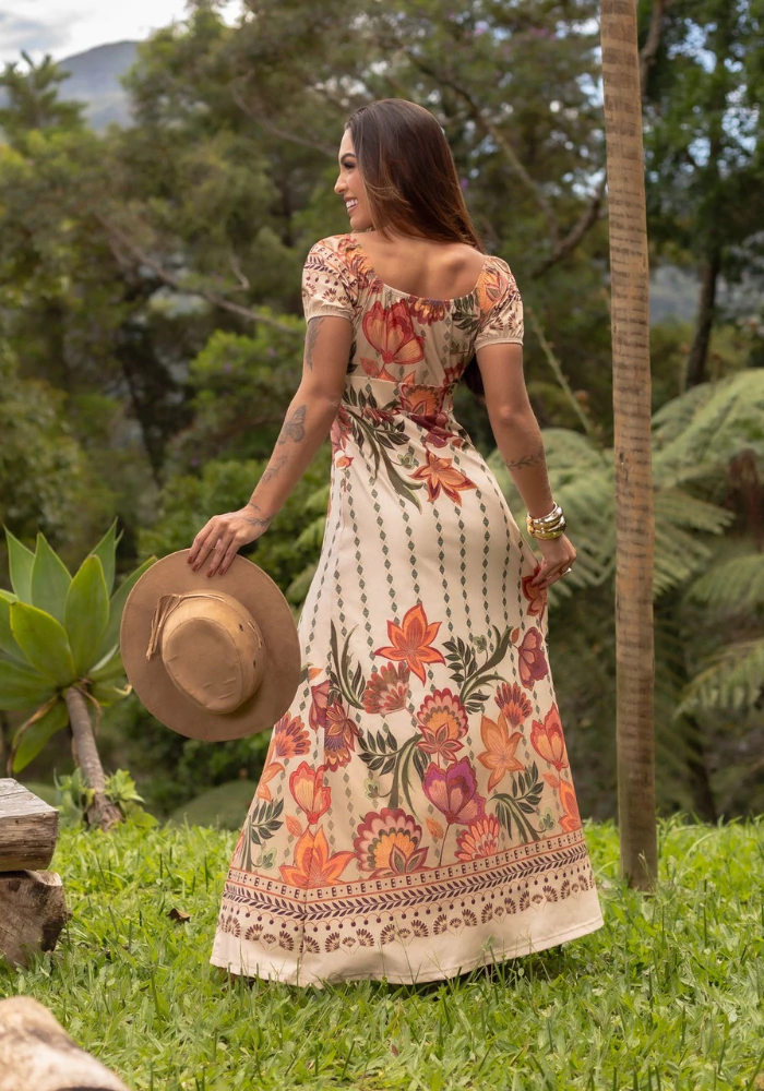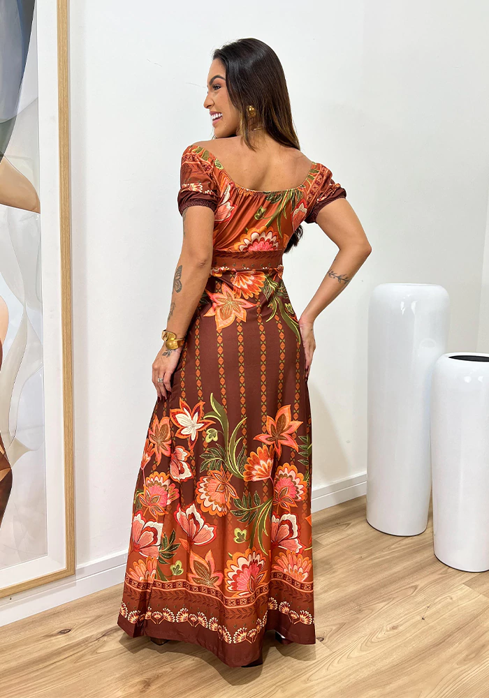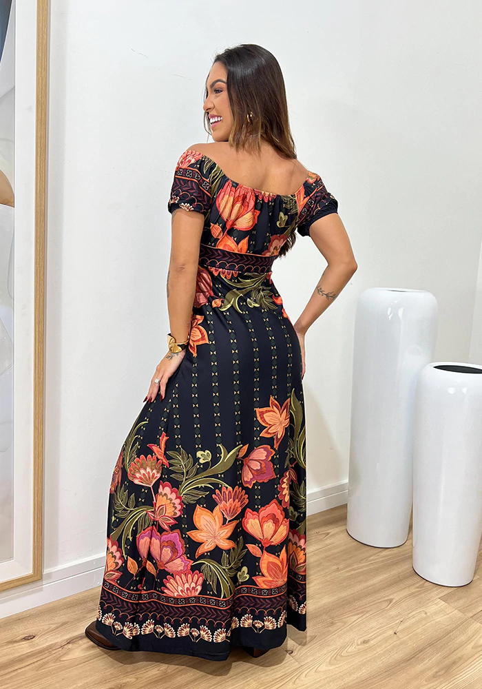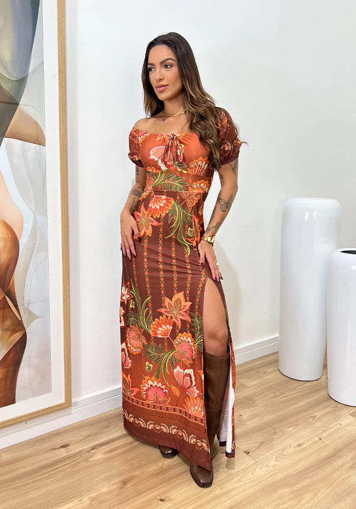 O vestido Emanuelly é uma peça longa e elegante, com modelagem ajustada que valoriza as curvas do corpo. Possui decote ombro a ombro com amarração central, criando um toque delicado e feminino. As mangas curtas adicionam charme e conforto. A fenda lateral traz sensualidade na medida certa, garantindo movimento e leveza ao andar. É uma peça versátil que combina estilo sofisticado com um ar descontraído.Tamanho: único (38 ao 44)Tecido: FluityComposição:92% poliéster 8% elastano