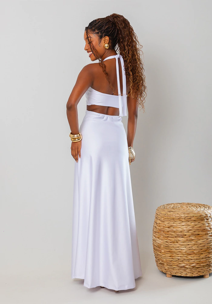 O vestido Denise é um modelo longo cheio de charme. Ele leva argola no centro do busto, que cria um franzido elegante e recortes estratégicos que valorizam a silhueta. As alças se cruzam na frente e amarram na parte de trás do pescoço, deixando as costas à mostra. A saia longa possui caimento fluido, garantindo movimento e leveza ao look.Tamanho: unico Tecido: trilobolComposição:85% poliester 15% elastano