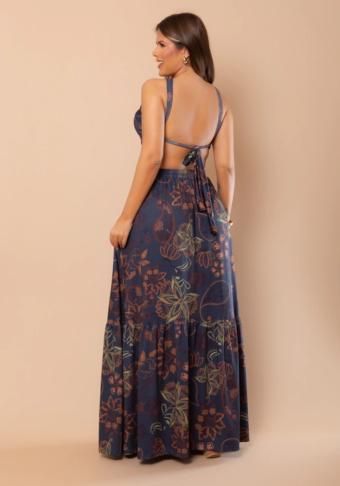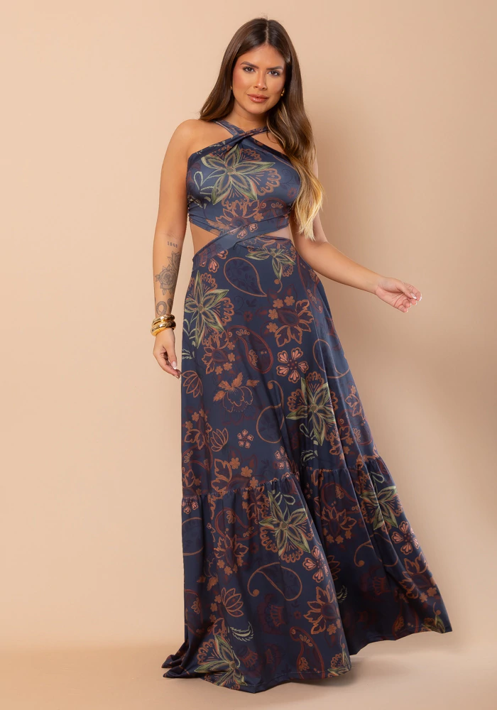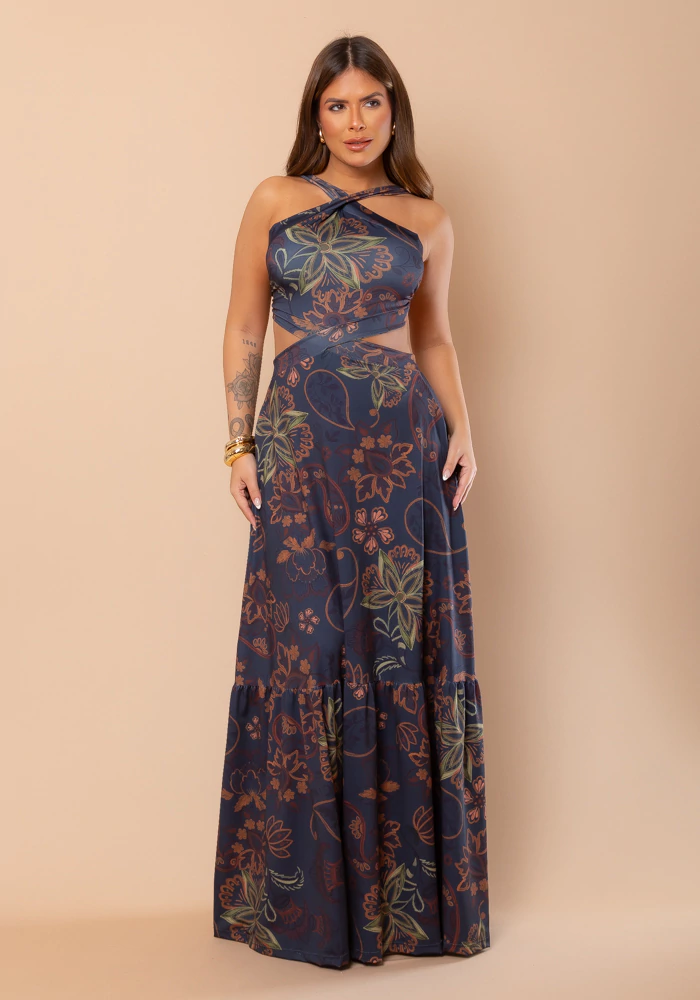 O vestido Maldivas é um modelo longo e fluido que transmite leveza e elegância. O decote é frente única com alças que cruzam no pescoço, criando um visual moderno, com recortes laterais que se encontram na parte de trás. As costas ficam totalmente à mostra com amarração regulável que garante melhor ajuste.A saia tem caimento amplo com um detalhe de babado franzido próximo à barra, que adiciona movimento e charme. Ele não leva bojo, proporcionando um visual mais natural e confortável. É ideal para ocasiões que pedem um look elegante com um toque descontraído e tropical.Tamanho: único (38 ao 44)Tecido: FluityComposição: 92% poliéster | 8% elastano