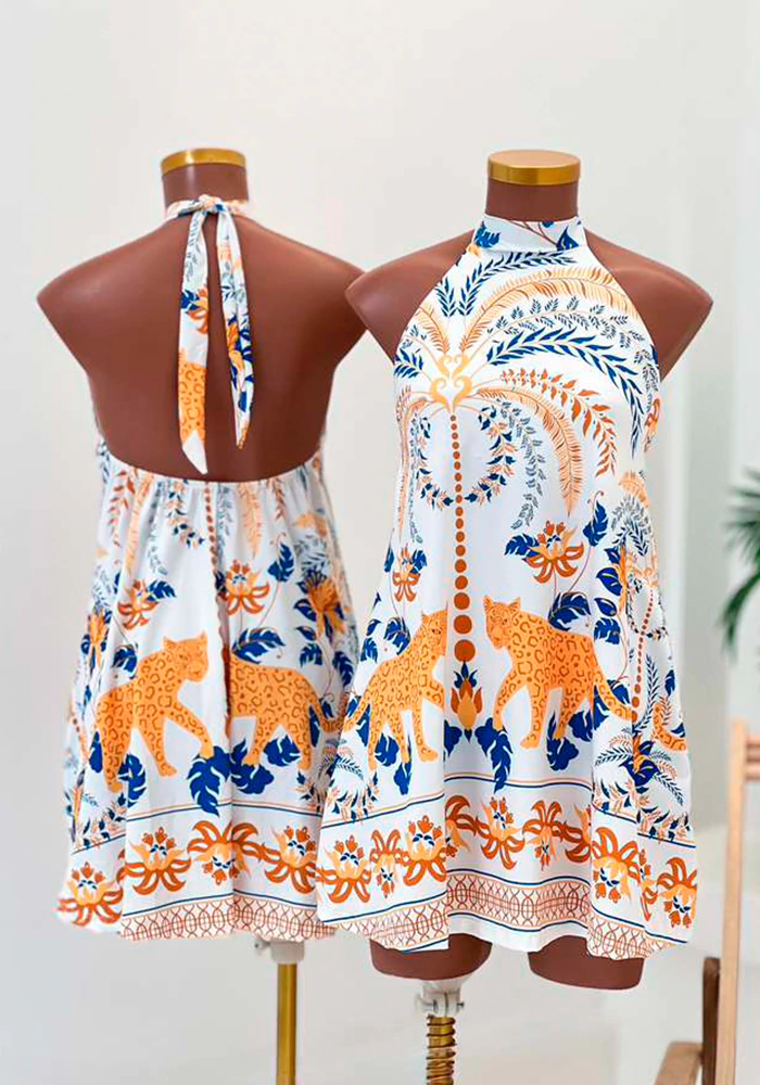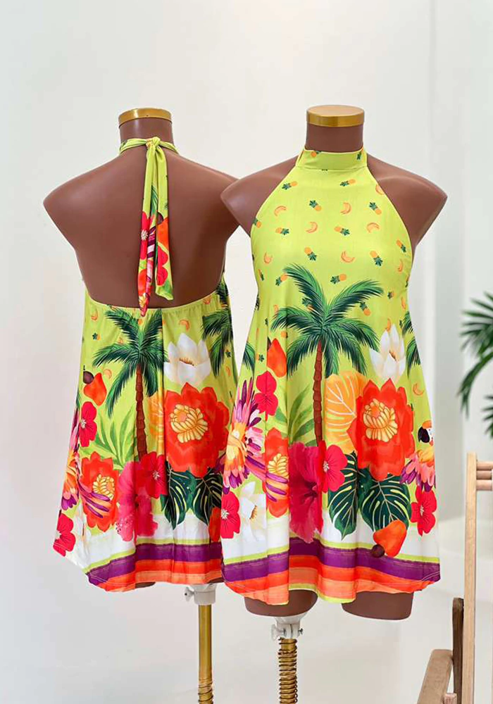 O Vestido Miami é curto e soltinho, com modelagem evasê que garante leveza e movimento. Possui gola alta que valoriza o colo e um recorte lateral que deixa um ombro à mostra, criando um visual moderno e charmoso. Confeccionado em tecido leve, traz estampa tropical em tons vibrantes de laranja, verde e amarelo, perfeita para dias ensolarados. É a escolha ideal para um look fresco e estiloso.Tecido:FluityModelagem: 38 ao 44Composição: 92 poliéster e 8 elastano