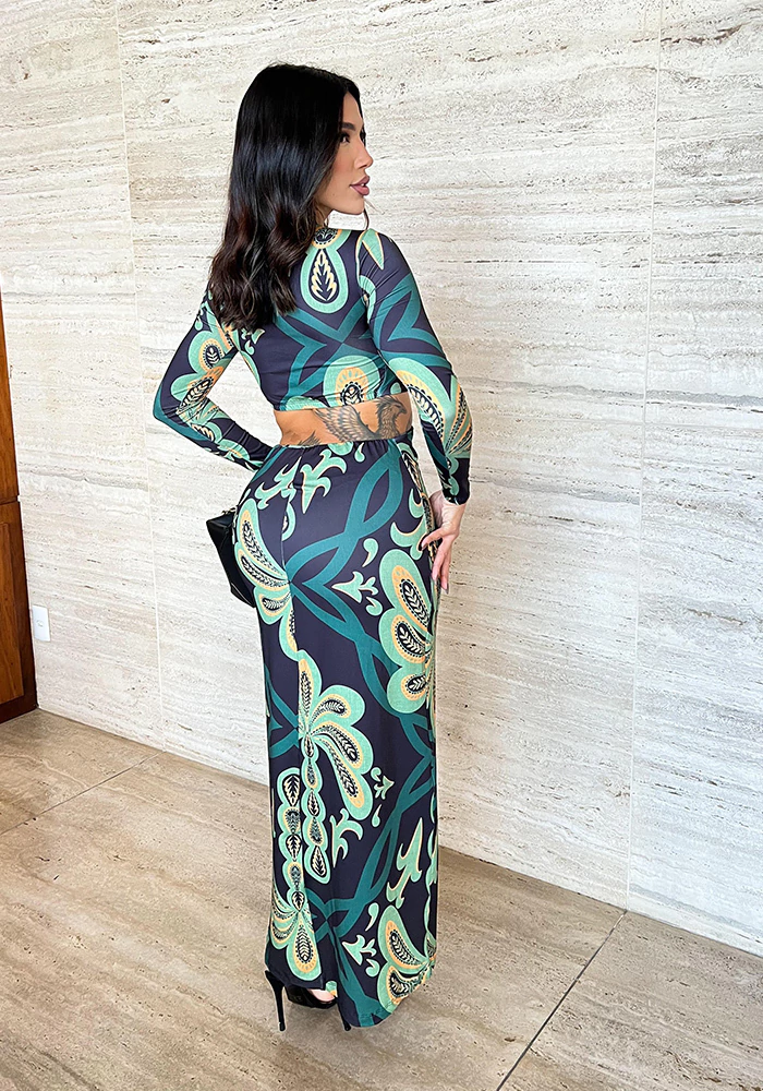 O vestido Naty é uma peça longa com modelagem sofisticada e moderna. Ele possui mangas longas e um franzido frontal que percorre toda a extensão central, criando um caimento elegante. Um dos destaques é a argola localizada na cintura, que conecta a parte superior à saia e dá origem a uma abertura lateral destacando a silhueta. Tamanho: UNICO (38 ao 44)Tecido:FluityComposição:92% poliéster 8%elastano