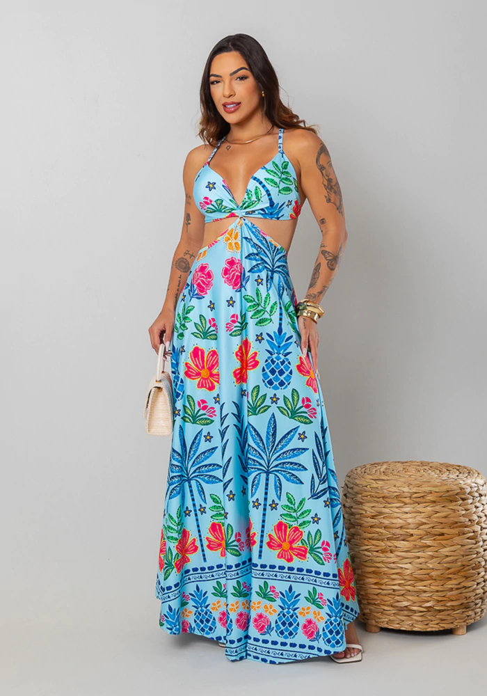 O Vestido Taís possui modelagem longa e fluida, com decote em “V” que valoriza o colo e argolinha central unindo o bojo à saia, criando um delicado recorte na cintura. A saia ampla garante movimento e leveza, ideal para compor looks elegantes e frescosTecido: fluityModelagem:unico (veste do 36 ao 44)Composição: 92 poliéster 8% elastano