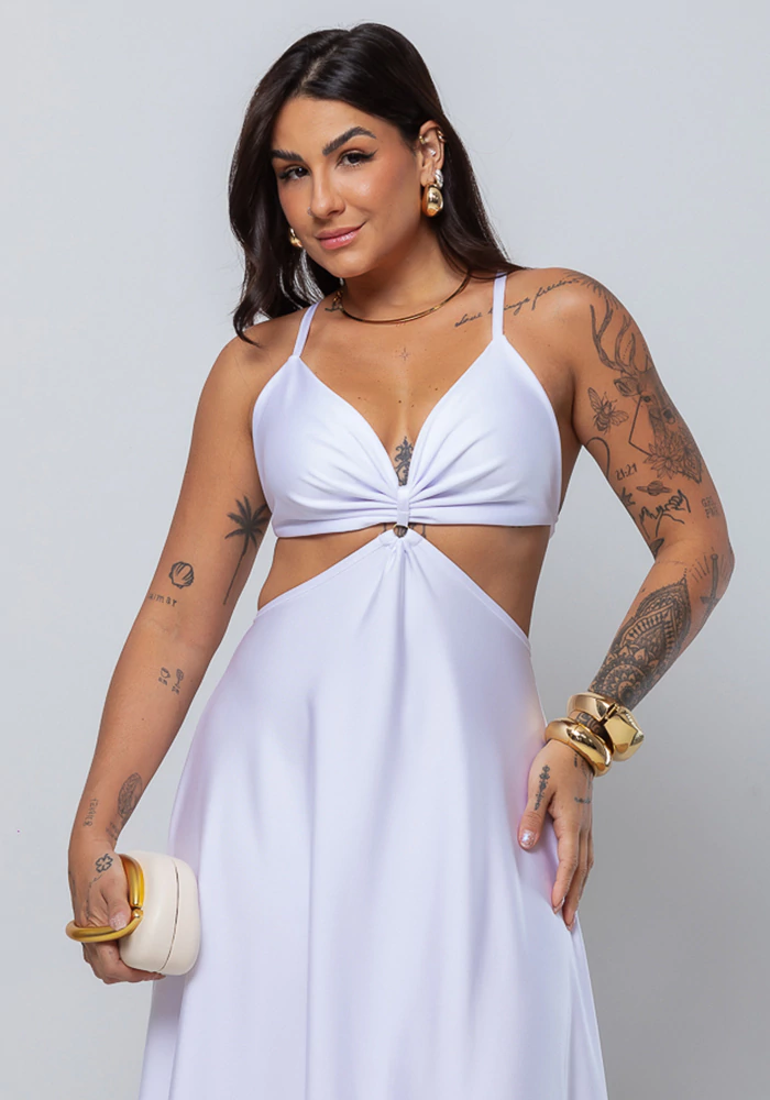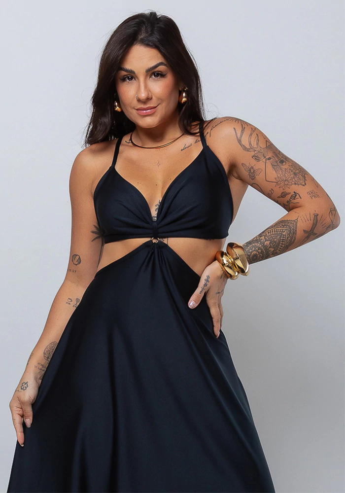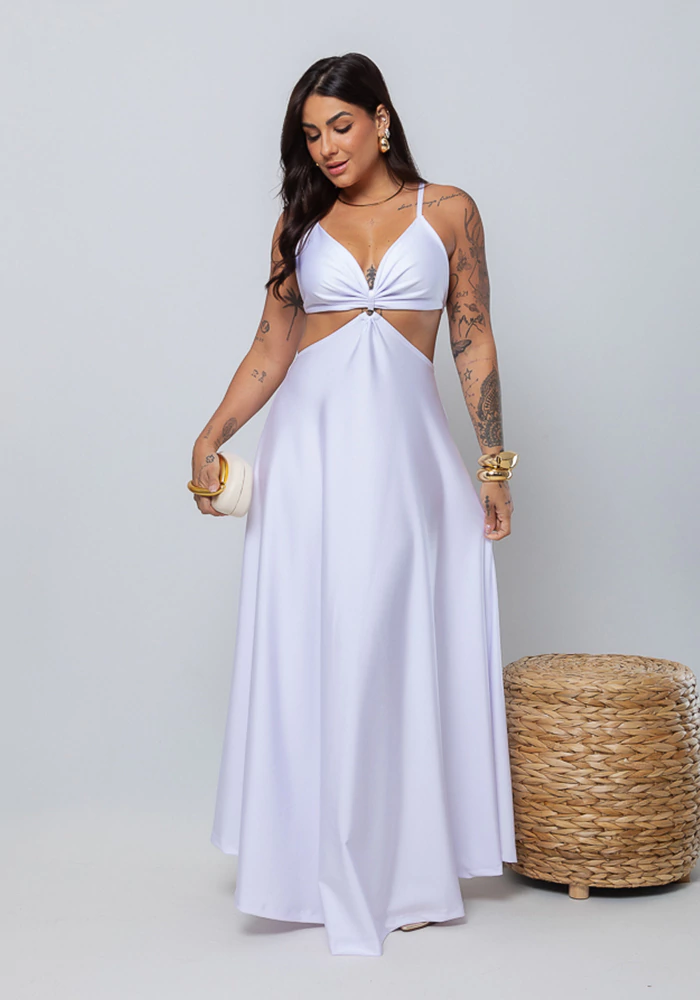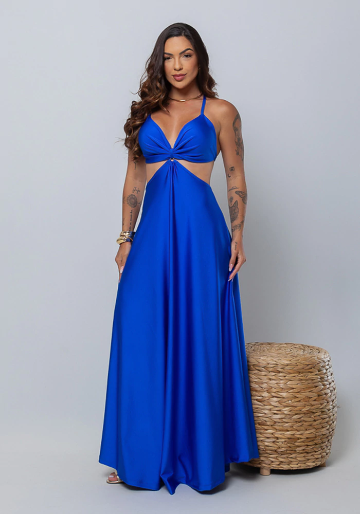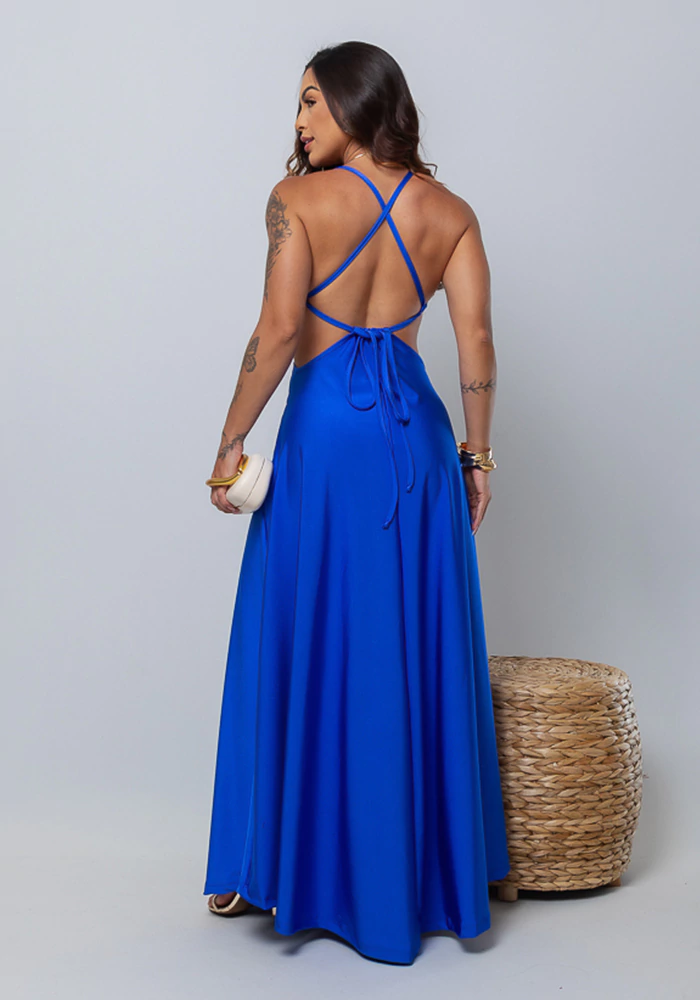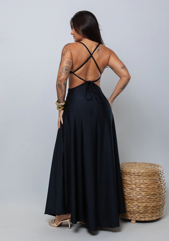 O vestido tem comprimento longo e modelagem fluida e elegante. Possui alças finas e decote em formato de triângulo, unido ao centro por uma pequena argola, criando uma sutil abertura na região do abdômen. A parte posterior é aberta, com amarração cruzada nas costas, proporcionando um toque delicado e moderno. O tecido tem aspecto liso e caimento suave, valorizando a silhueta de forma natural. É uma peça ideal para eventos ao ar livre ou ocasiões especiais, unindo sofisticação e leveza.Tamanho: unico (36 ao 42)Tecido : trilobolComposição:85% poliester 15%elastano