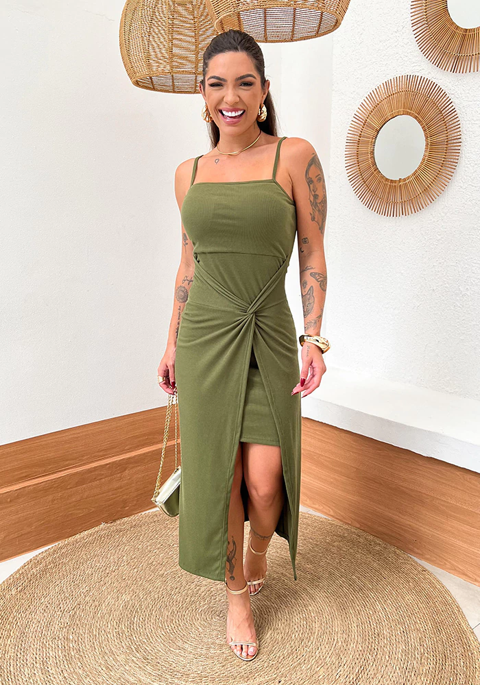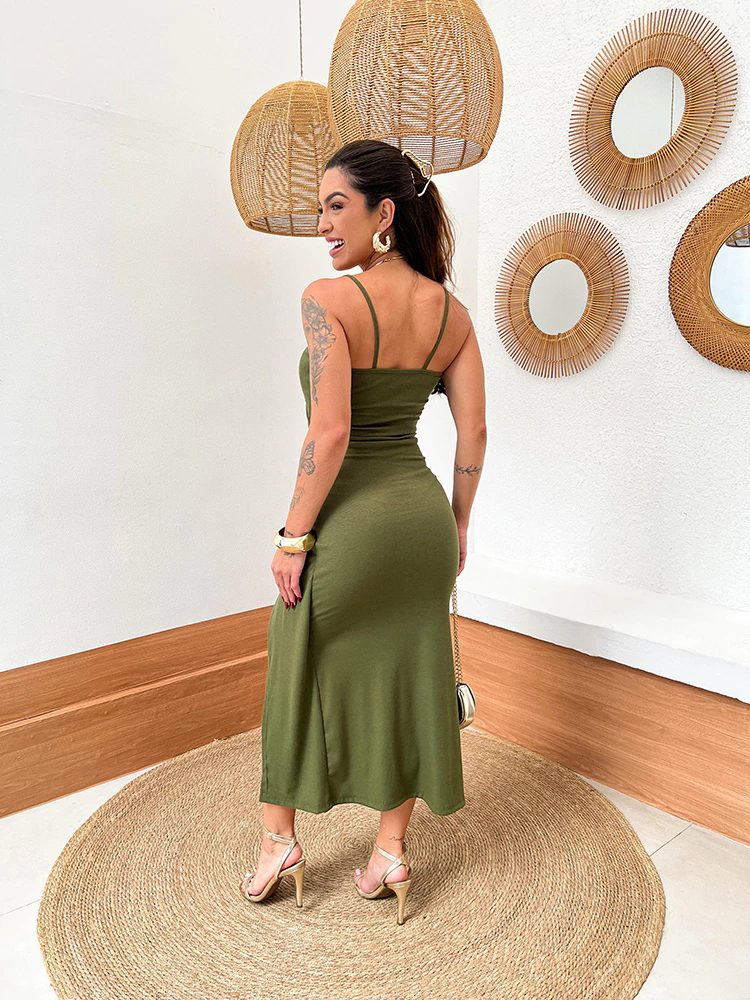 O Vestido Vênus é um modelo midi sofisticado e moderno. Ele possui alças finas, decote reto e bojo embutido que garante sustentação e valoriza o busto.O destaque da peça está no drapeado central que cria um efeito torcido na cintura, afinando a silhueta e trazendo um toque elegante. A fenda frontal proporciona leveza e sensualidade, deixando o visual mais estiloso e feminino. Tamanho: único (38 ao 44) Tecido: malha canelada Composição: 96% poliéster | 4% elastano